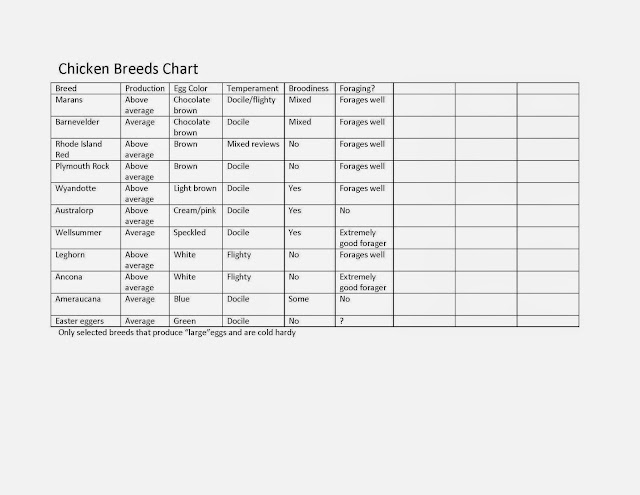 Also, there was a chart in the Storey’s Guide to Raising Chickens about Large Breeds. So, I combined these resources to pick the chickens we would like to have on our farm. I have it narrowed down to the chickens in this chart: