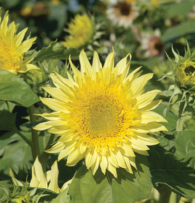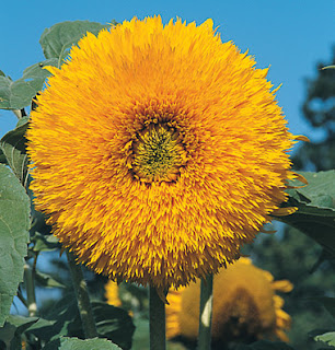 GIANT SUNGOLD: Fully-double, yellow-gold flowers. A tall, Teddy Bear-type with up to 8″ blooms.