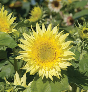 STARBURST LEMON AURA Gorgeous, pale yellow, branching double. Lovely, fully-double blooms on long, sturdy stems cover this compact plant. The light yellow shade lends itself well to pastel bouquets making it a great addition to an existing sunflower line.