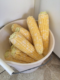 At the Farmer’s Market, someone from Kallstrom Corn came over and bartered for some huckleberry jam. Then, my neighbor brought me over some corn that he got from his friend in Lewiston. So, while the cheese was busy fermenting and curding (is that a word) and draining…I decided to process some corn to freeze…