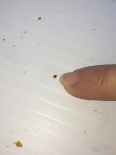 So, after hearing the speaker, I was concerned so I went to my hive and pulled out the bottom white board. See, the bottom of my hive has a screen and then here is a white bottom board under that. I can pull out that white bottom board and see what has fallen through the screen.