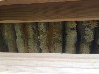 There are definitely less bees in the hive. In the fall, the hive will get smaller. The drones are often kicked out of the hive because they are not really needed. Because there are less bees, you can see the honeycombs better.