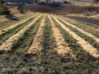 I was using up the pine shavings from our guinea pig cages. I would get a large garbage bag size each week. So, I would haul them out and put down the cardboard/newsletter and then place the used shavings on top. This took weeks to do and I finally just had to buy shavings to finish the last two rows. I wanted to have it finished before we got our first snow. Lucky for me that we have had such a mild fall with lots of rain!