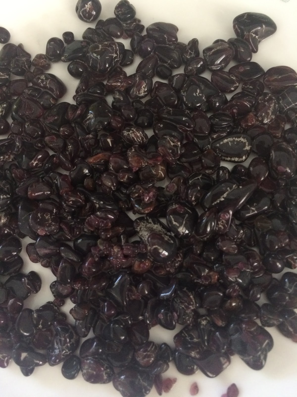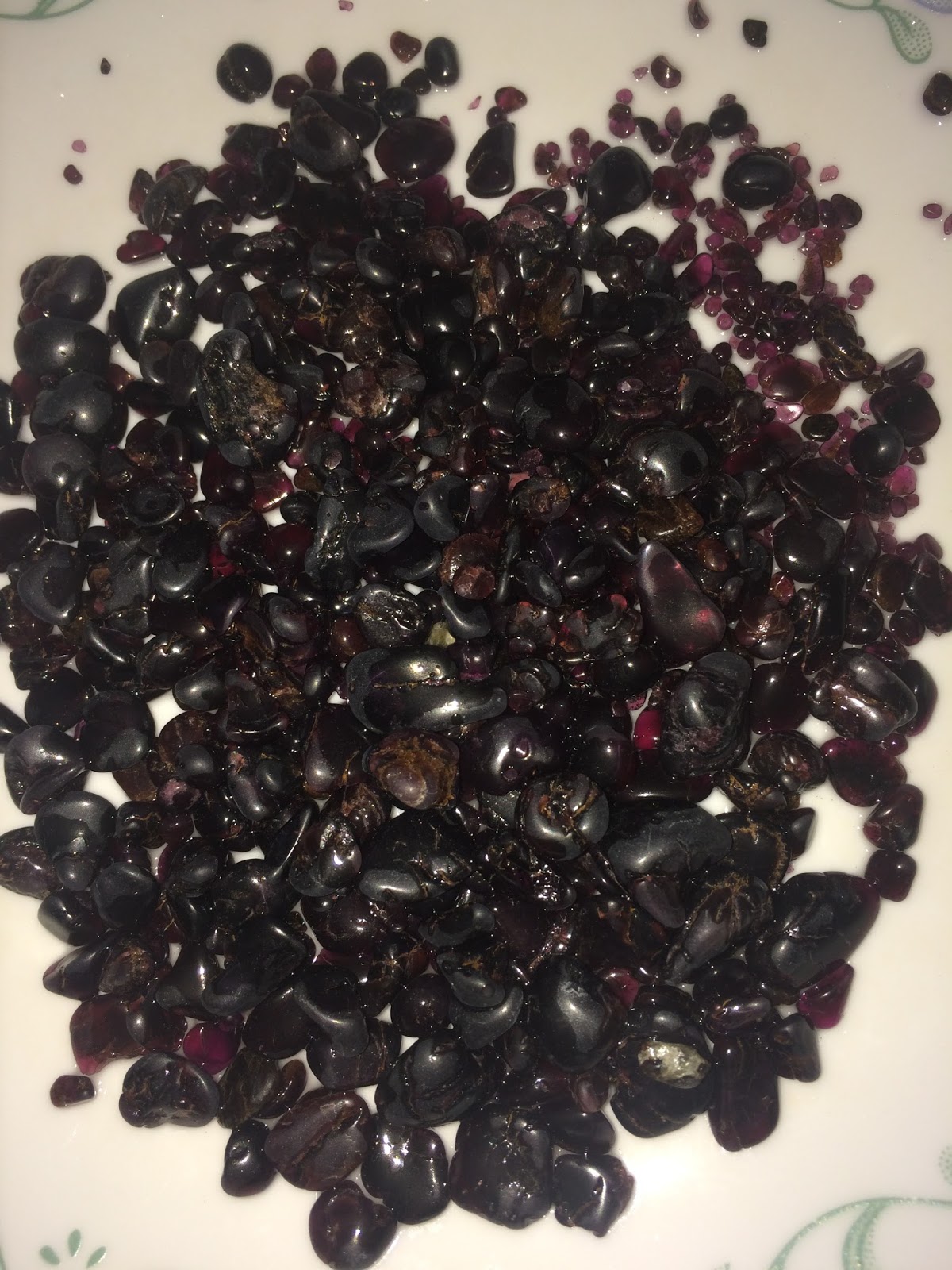 Anyway, after 5 years of collecting garnets, I decided to try and put them into a rock tumbler to make them look nicer. The rough stones are not so pretty. There are 4 steps to tumbling. You start with a course grit and then the grit gets smaller and then there are 2 polishing steps at the end. It takes weeks. The first step takes 2 weeks alone.