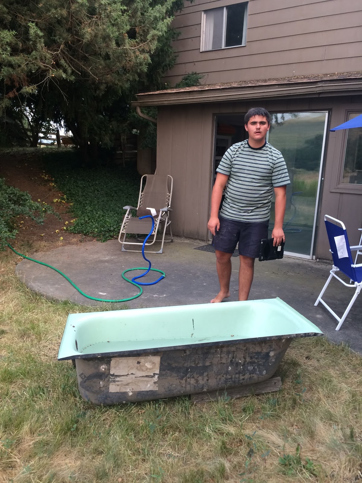 Mom and dad worked on a lot of projects in between all the sightseeing.  They dragged this old tub out of one of the barns and cleaned it up and filled with water.  Then, we put some rocks there for Mark.  One of his favorite things is to throw rocks into water and now he can go out back and do that whenever he wants!