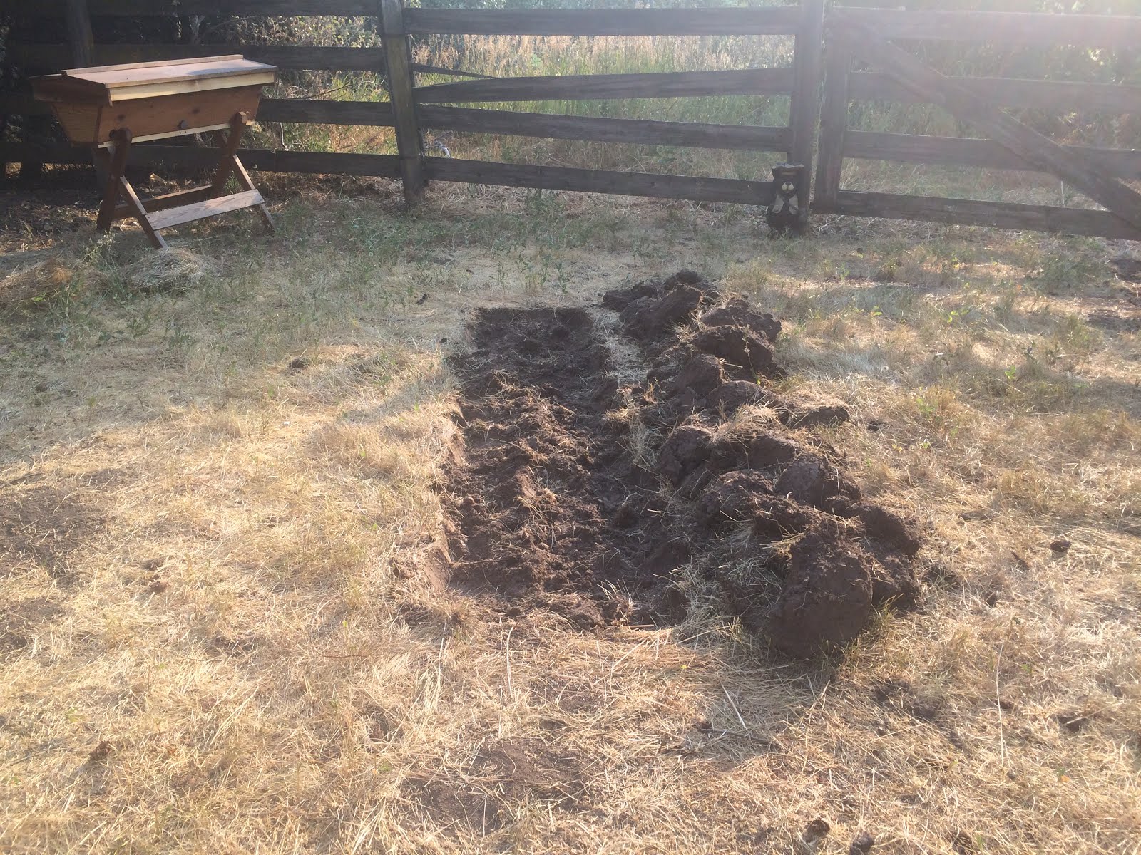 Then, I filled the trench with large limbs. These were all collected right on the other side of that fence in the background. So, it was nice to clean out all those dead limbs out of the pasture area and put them to good use!