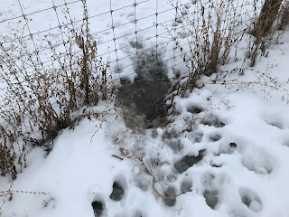 1. Fencing, Fencing, Fencing – the idea is to completely fence in our entire property.  I have about half the money saved for this project and I am hoping to get the rest saved up this winter/spring and to have the project done late summer or early fall.  Most of the property is already fenced.  We just need to enclose the “front yard” where the chickens will be.  The idea is not to have a fortress against predators…I am well aware that they will still be able to find their way in.  The fencing is more to keep our future livestock guardian dog in/on our property.  I took advantage of having the snow on the ground to walk the perimeter of the property and found this…