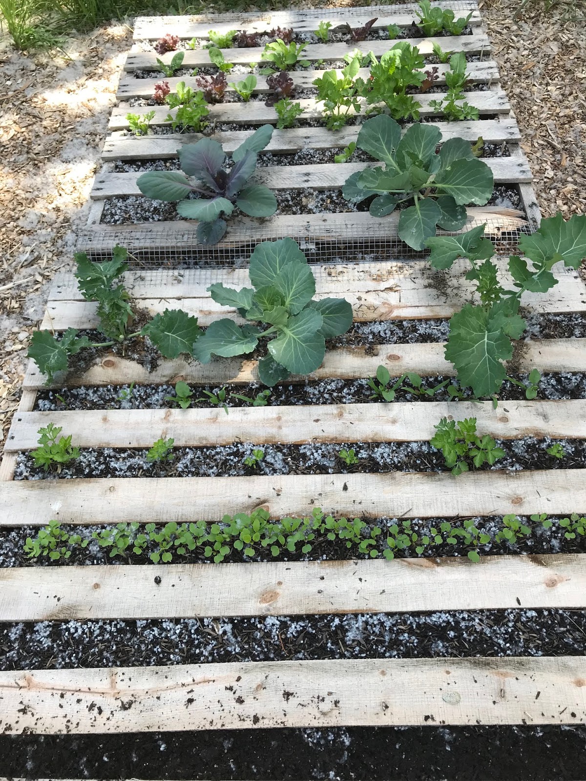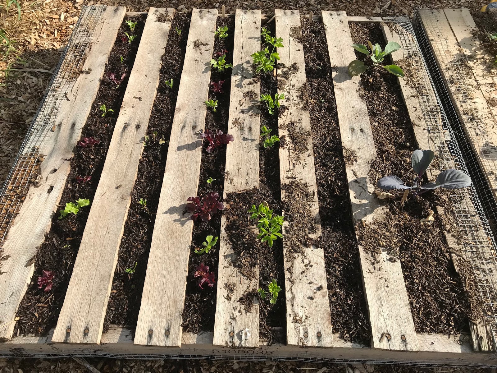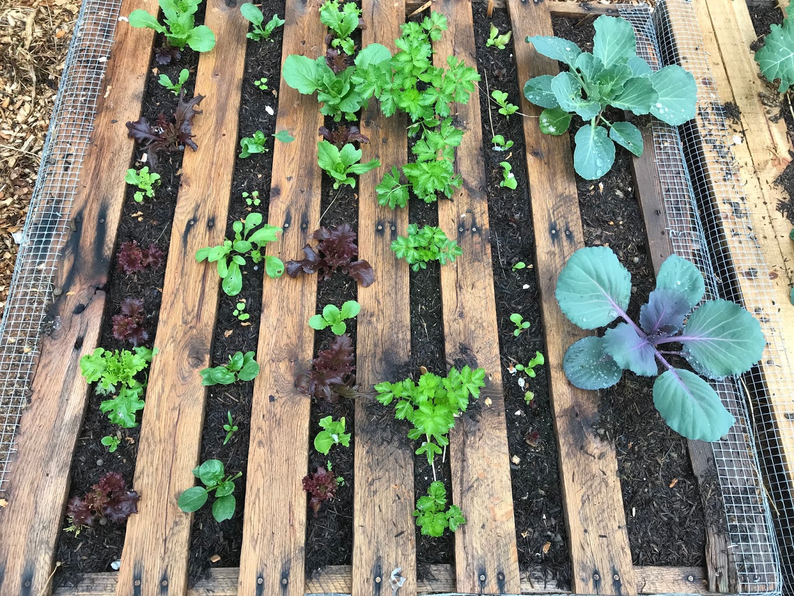 Pallet garden when it was first planted…lettuce, spinach, lettuce, celery, lettuce, and 2 cabbage. |