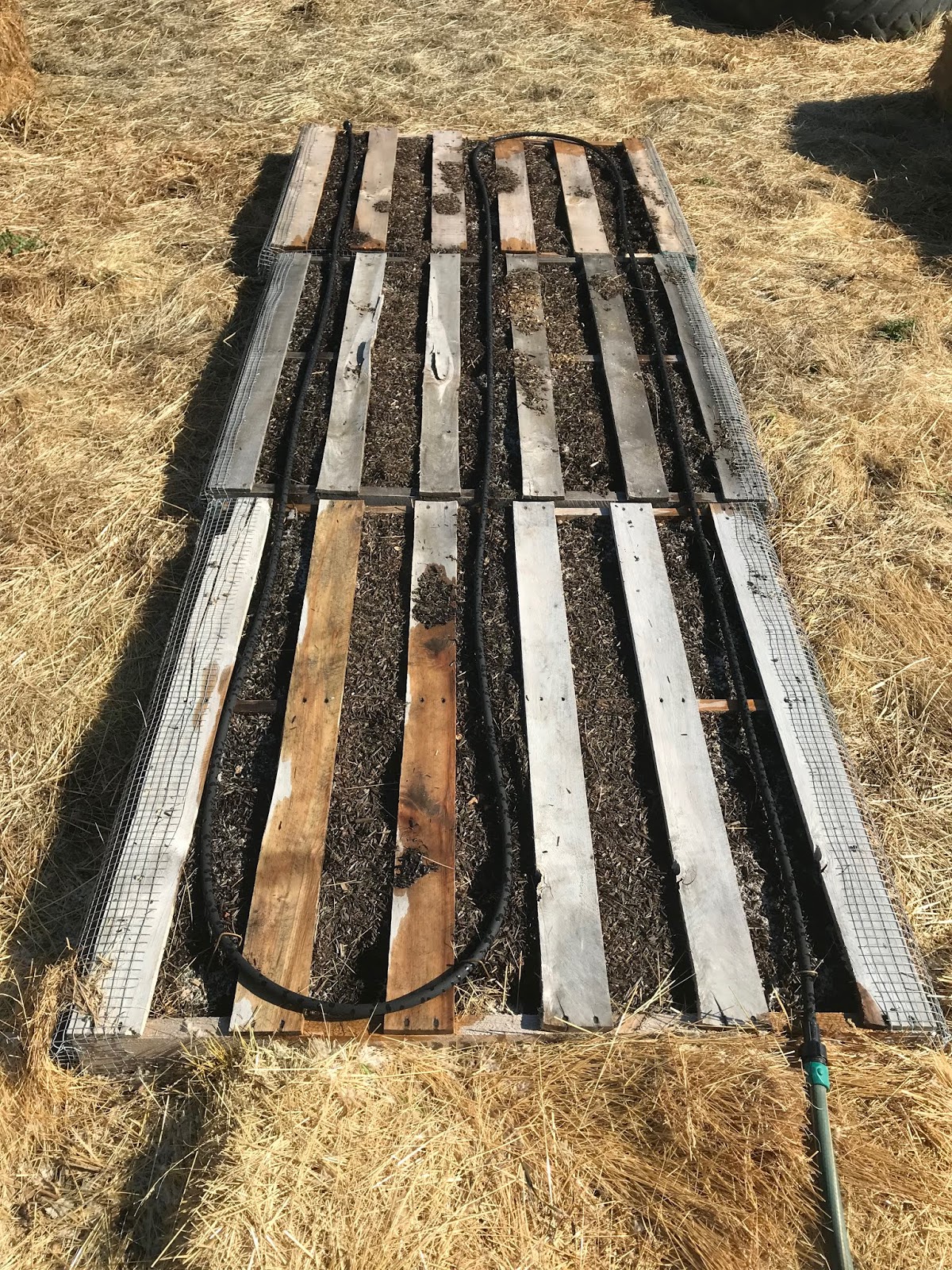 These are the pallets for the green beans. I will only plant where the drip hose is laid out (rows 1, 3 and 5 of the pallets) and mulch it with hay once the plants get up…
